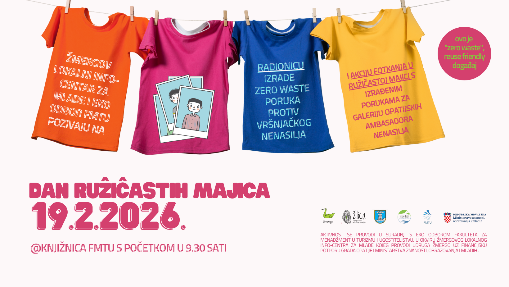 Eko odbor FMTU i Udruga Žmergo Opatija pozivaju Vas da nam se, u četvrtak 19. veljače 2026. u 9.30 sati, pridružite u knjižnici Fakulteta povodom obilježavanja Nacionalnog dana borbe protiv vršnjačkog nasilja – Dana ružičastih majica. Tom prigodom izrađivat će se zero waste natpisi (od starog papira, kartona i koverti) s porukama na stranim jezicima pod sloganom #nasiljeprestajeovdje.