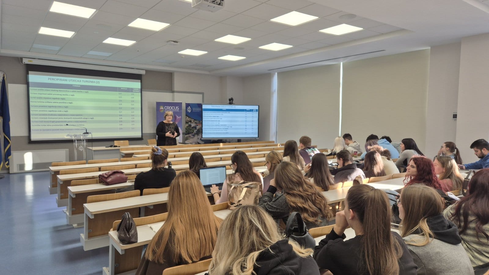 The lecture placed special emphasis on presenting the results of research conducted within the CROCUS project, which covers the cross-border areas of two municipalities: Matulji (Croatia) and Ilirska Bistrica (Slovenia). The lecture explored opportunities that encourage the development of cultural and creative tourism in rural and remote areas, with particular focus on border regions. The aim of the lecture was to familiarise young people—future tourism professionals—with the importance of sustainable development of rural cross-border areas and to highlight the significance of preserving cultural heritage as a foundation for innovative and sustainable tourism development.