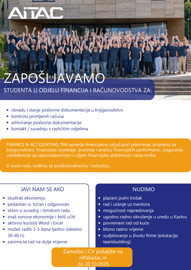 Analitična si osoba koja je s brojkama “na ti” i znaš da te računovodstvo stvarno zanima? Pri kraju si studija i tražiš priliku da kroz plaćenu praksu ili studentski posao napraviš prve ozbiljne korake u struci? Ako su odgovori da, ovo bi mogla biti prava prilika za tebe!